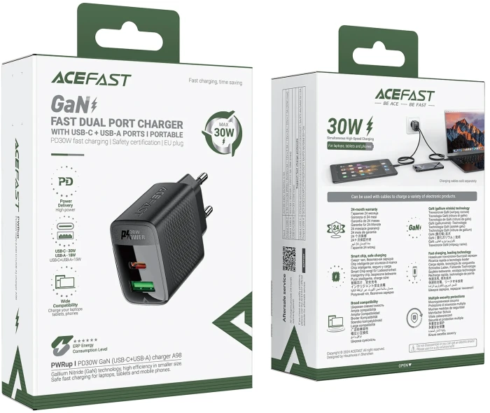 | ПОРТОВЕ, МОЩНОСТ | USB-C (30W Max) : 3.3V-11V ~3A (PPS) / 5V/9V~3A / 12V~2.5A / 15V~2A / 20V~1.5A USB-A (18W Max): 5V~3A / 9V~2A / 12V~1.5A |