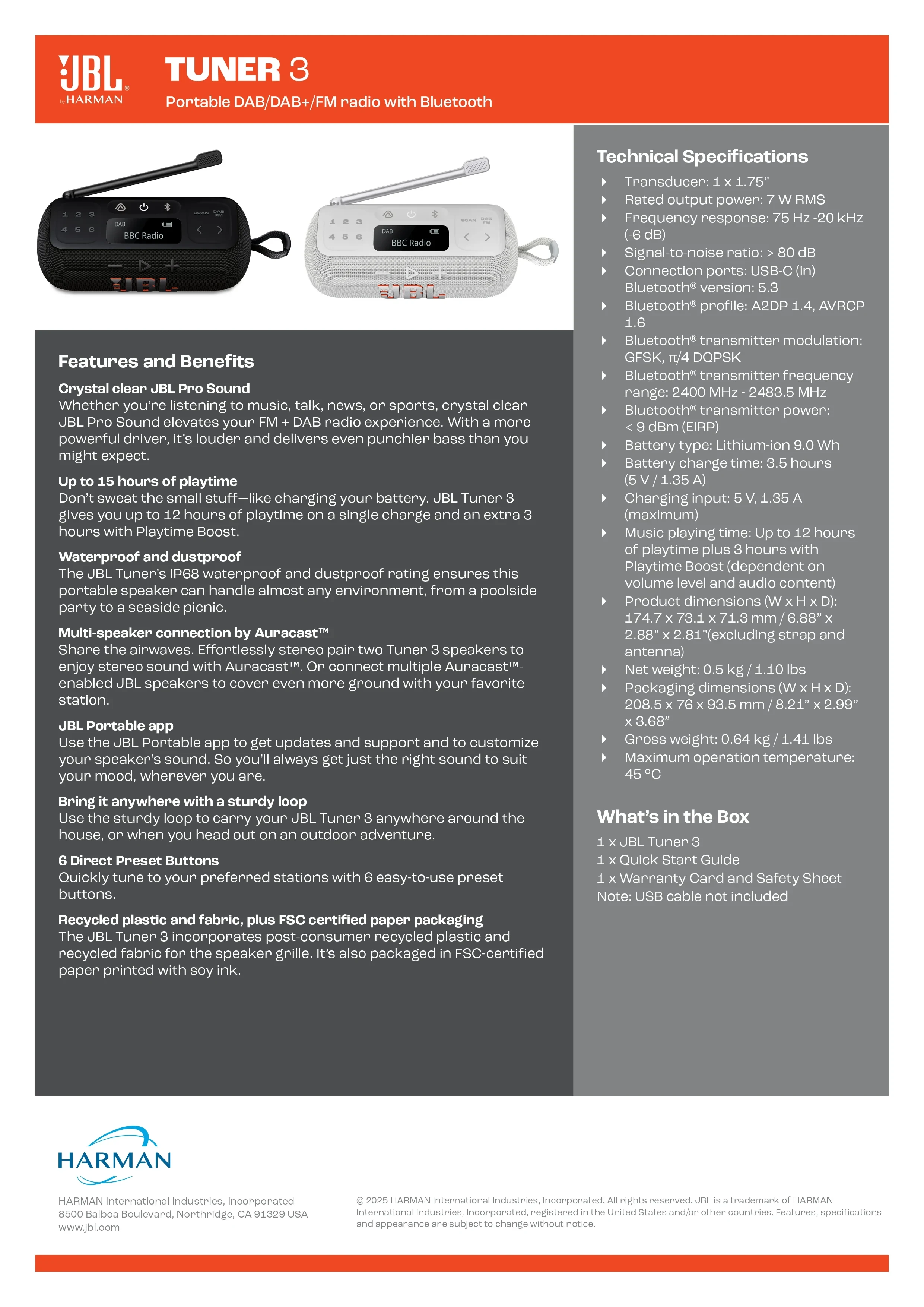 Crystal clear JBL Pro Sound | Crystal clear JBL Pro Sound | Waterproof and dustproof | DAB/DAB+/FM