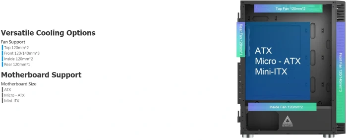 Rear: 1 x 120 mm Front: 3 x 120/140 mm Top: 2 x 120 mm |