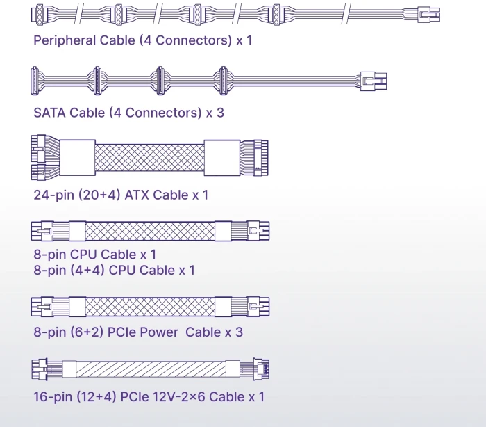 ATX 24-pin x 1 CPU 4+4-pin x 2 SATA x 12 MOLEX x 4 PCI-e 5.1 (16pin) 12V-2x6 pin x 1 |