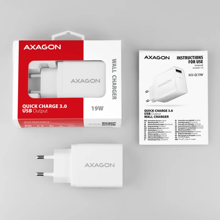 AXAGON ACU-QC19W USB wall charger with Quick Charge 3.0 technology to quickly charge mobile devices.