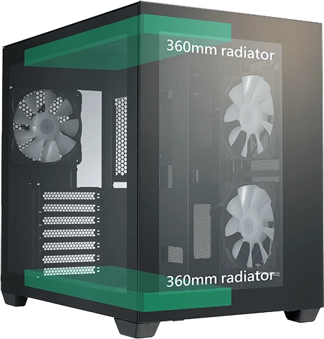 Rear: 1 x 120 mm Top: 3 x 120/2 x 140 mm Bottom: 3 x 120 mm Side: 2 x 120 mm |