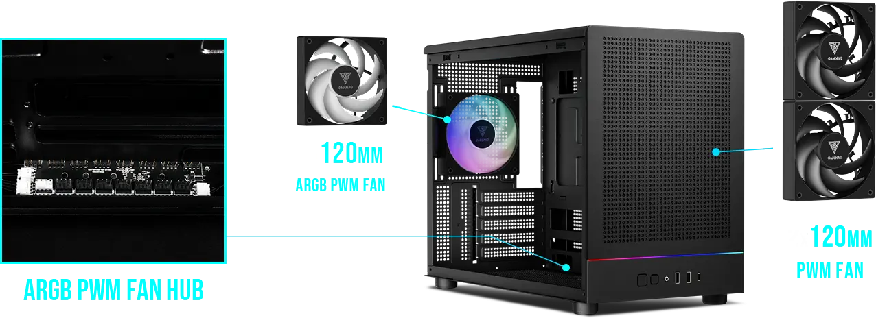 Front fans: 2 x 120mm black noLED | Rear fan: 1 x 120mm ARGB