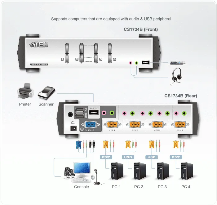 CS1734B е 4-портов KVM превключвател с 2-портов USB 2.0 хъб.