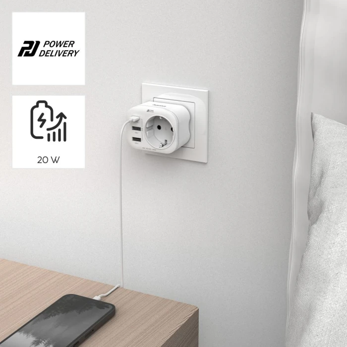 Компактен адаптер с множество гнезда без кабели: просто включете в съществуващия контакт и незабавно преобразувайте една връзка в четири - давайки на електрическите устройства допълнителни възможности за свързване и зареждане с USB-C, USB-A и заземен контакт